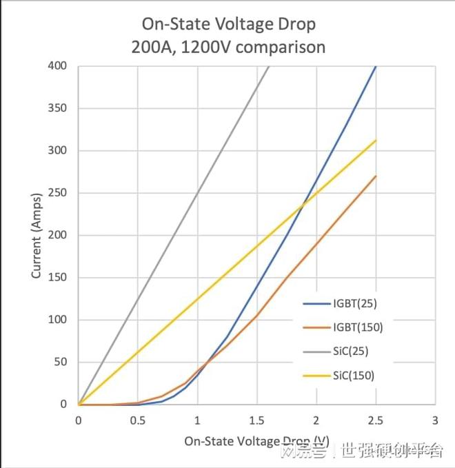 【图1:第一象限传导中SiC FET与IGBT的导通状态压降】